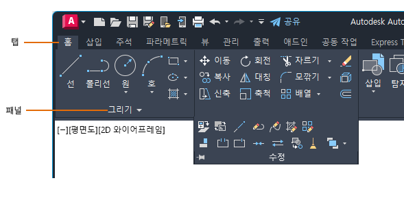 리본은 일련의 탭으로 리본 탭과 패널로 구성되며, 이러한 탭은 도구막대에서 사용 가능한 여러 도구 및 컨트롤이 포함된 패널로 구성됩니다.