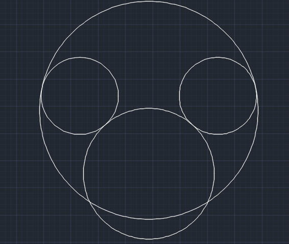 위와 같은 도면을 작성할 때는 2개의 원과 아웃 접점과 아래의 인 접점으로 원을 그린 후 Trim (자르기)를 이용하여 위의 도면을 작성합니다.