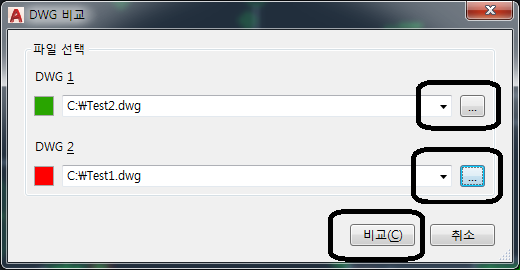 2. DWG 비교 대화상자에서 두개의 다른 도면을 선택합니다.