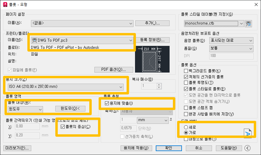 - 플롯 축척 : 용지에 맞춤, 축척 설정