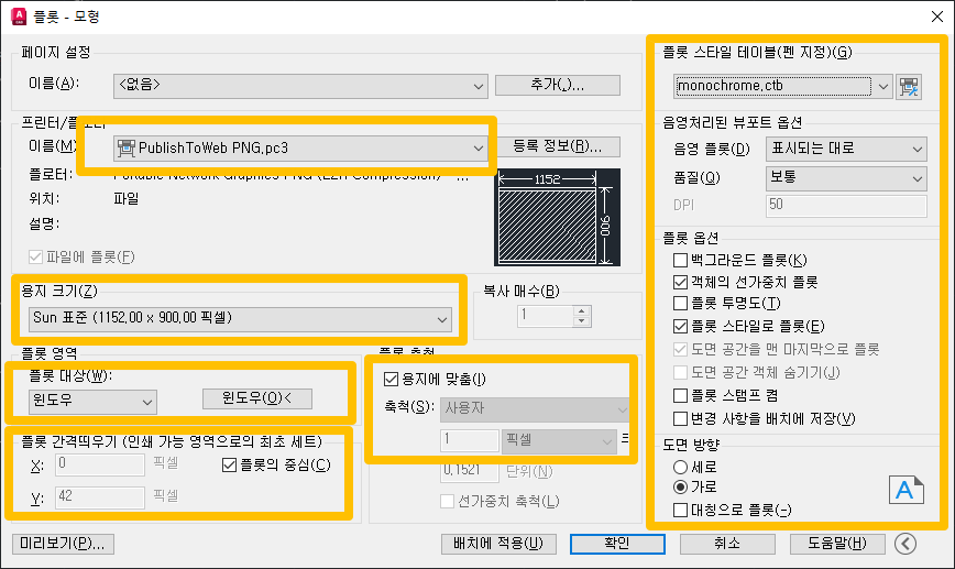 - 플롯 스타일, 음영처리, 플롯옵션, 도면방향들을 적절히 선택하고 확인을 누릅니다.