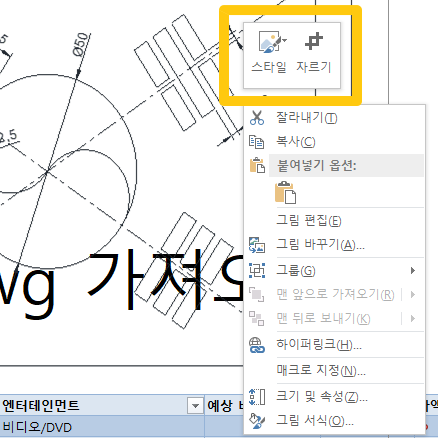 그러나, 크기와 빈 여백이 맞지않게 되어 있을 수 있으며, 이때 AutoCAD 도면 이미지를 선택하고 마우스 오른쪽 버튼을 클릭하면, 아래와 같이 자르기 아이콘이 나타납니다.