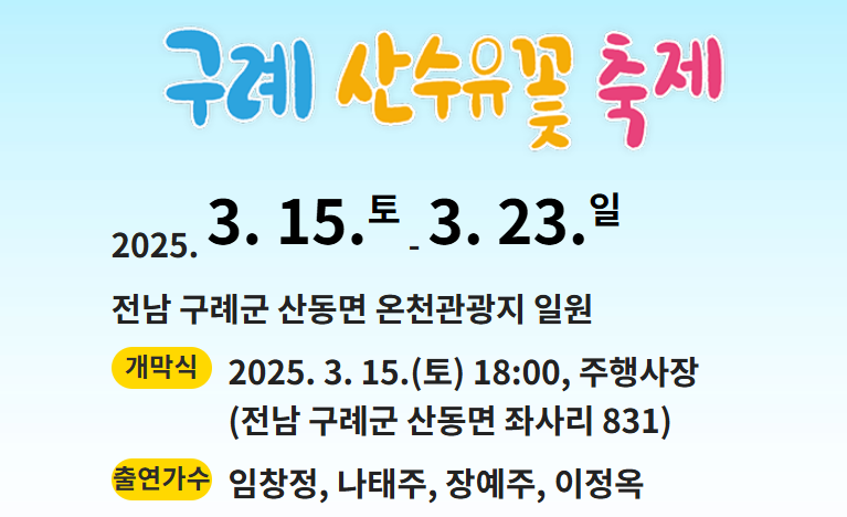 - 특징 : 구례에서 열리는 산수유꽃축제는 노란 산수유꽃이 만개하며, 지역 주민들과 함께 즐길 수 있는 다양한 프로그램이 마련됩니다.