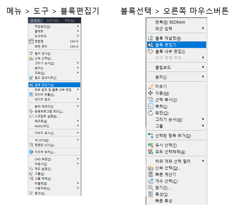 블록 편집기 실행방법은 메뉴를 이용하는 방법과 블록을 선택한 후 마우스 오른쪽 버튼을 이용하여 팝업메뉴를 이용하는 방법이 있습니다.