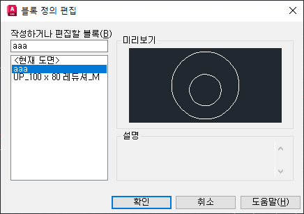 위 이미지는 블록 편집기 오토캐드 화면이며, 블록의 모양을 변경하거나 이동, 삭제하여 편집하면, 블록의 내용이 변경됩니다.