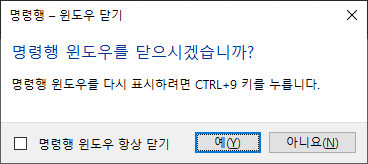 "명령행 윈도우를 닫으시겠습니까?" 예(Y)를 누르면 명령창이 사라지게 됩니다.