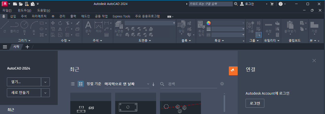 3 : 새 도면을 열거나 작성하면 시작 탭이 표시되고 리본이 미리 로드됩니다.