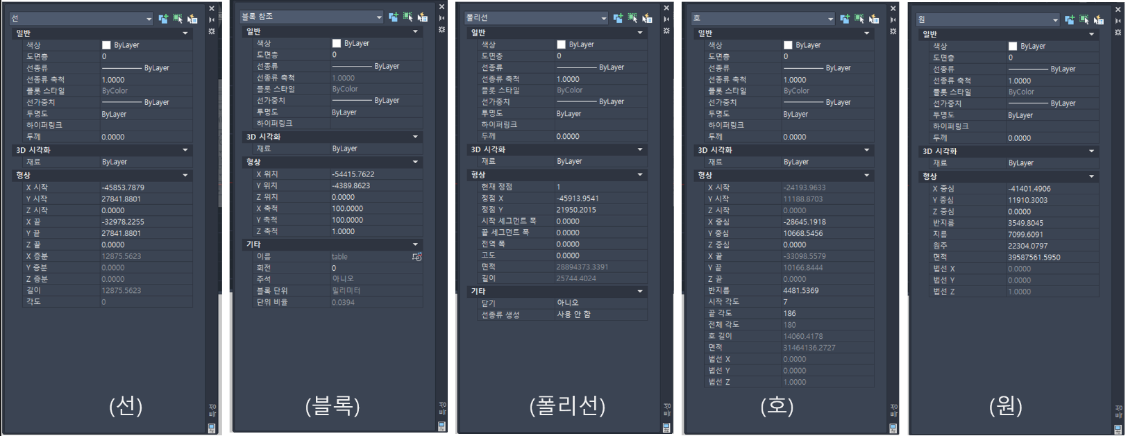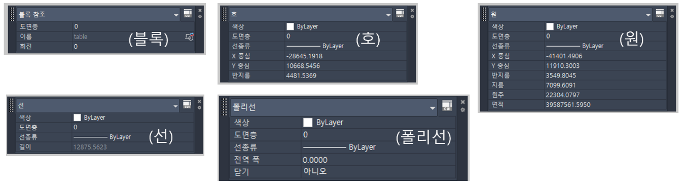 위의 이미지는 블록, 선, 호, 원, 폴리선 등의 특성정보를 팔레트로 보여지며, 편집할 수 있습니다.