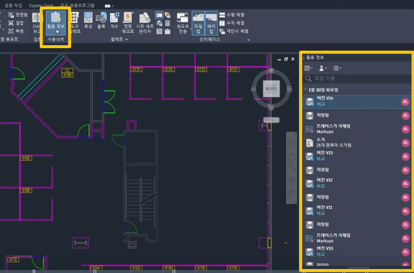 활동 유형, 사용자 및 날짜별로 활동을 기록하여 도면 사용내역을 확인할 수 있습니다.